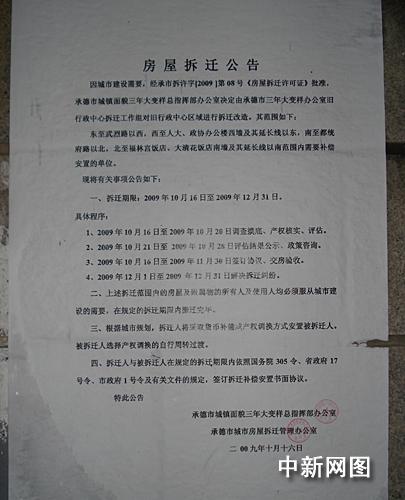 在10月16日由承德市城鎮(zhèn)面貌三年大變樣總指揮部辦公室以及承德市房屋拆遷辦公室印發(fā)的《房屋拆遷公告》明確顯示:10月16日至10月20日為老行政中心房屋產(chǎn)權(quán)調(diào)查摸底、產(chǎn)權(quán)核實、評估階段,并由“承德市三年大變樣辦公室舊行政中心拆遷工作組”實施拆遷。而金源公司于10月18日就開始強(qiáng)行拆除皇家安裝工程公司辦公用房。