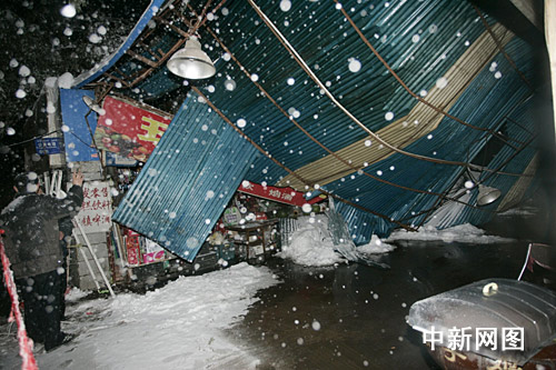 中新網(wǎng)石家莊11月10日電(李光)今天下午,河北省石家莊市槐中路新世隆商場(chǎng)附近一自由市場(chǎng)由于頂蓬積雪過(guò)多被壓塌。