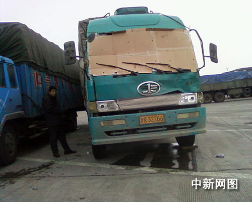 車停下后,只見該車司機被凍的臉色發(fā)紫,不停地搓手取暖。詢問得知,該司機姓李,山東人,幾天前李某到武漢拉貨,在湖北境內發(fā)生交通事故,導致貨車駕駛室前部凹陷,擋風玻璃破碎。為趕時間送貨,于是李某找來廢舊紙板代替擋風玻璃。李某告訴民警,車多時他就把頭伸出駕駛室看方向,伸累了就憑感覺判斷方向開車,他就這樣提心吊膽的行駛了數(shù)百公里。