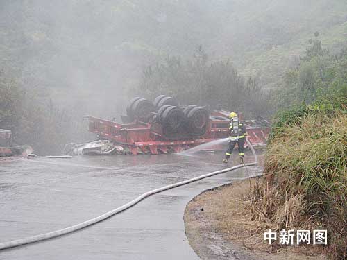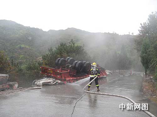 中新網(wǎng)溫州11月20日電(記者 江耘 通訊員 徐行號(hào))11月20日早晨6時(shí)許,浙江樂(lè)清市樂(lè)成鎮(zhèn)往白石鎮(zhèn)方向的盤(pán)山公路轉(zhuǎn)彎處一輛載有15噸的鹽酸的半掛車發(fā)生側(cè)翻泄漏事故。