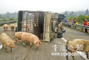 昨日,豬販汪祥全受到處罰。來(lái)自市高速公路支隊(duì)的消息稱,近幾年,高速公路上不時(shí)出現(xiàn)運(yùn)輸生豬貨車(chē)翻車(chē)后豬群亂串的狀況,其中曾有100多頭豬在成渝高速路亂串,先后引發(fā)4起車(chē)禍、3人受傷,道路封閉4小時(shí)。