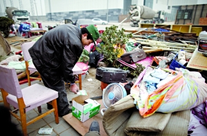 昨日上午9時許,百子灣家園東側(cè)空地上圍起警戒線。四五十名住戶不肯離去,身旁堆著鍋碗瓢盆、被褥、衣物等!胺孔颖徊鹆,晚上都不知住哪兒!币晃粙D女坐在自家被褥上哭了起來。她懷中3歲女孩穿著單薄毛衣,凍得直流鼻涕。