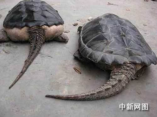 于先生把兩件“寶物”拿到室外讓我們觀賞。由于時下已是冬季,它們正處于半冬眠狀態(tài),趴在地上慢慢蠕動,對圍觀的群眾投以好奇的目光。個頭較大的那只,不停張嘴覬覦著四周。經(jīng)仔細(xì)觀察,其長相集龜和鱷魚于一體,尤其是粗壯的尾巴,與鱷魚的尾巴無疑。體長一尺有余,背殼直徑二十多厘米,上有三條凸起的三角形棱脊,并有放射狀斑紋。頭部較粗大,不能完全縮人殼內(nèi),脖短長有褐色肉刺,尾巴尖而長,長有肉突刺,爪子尖而有力。