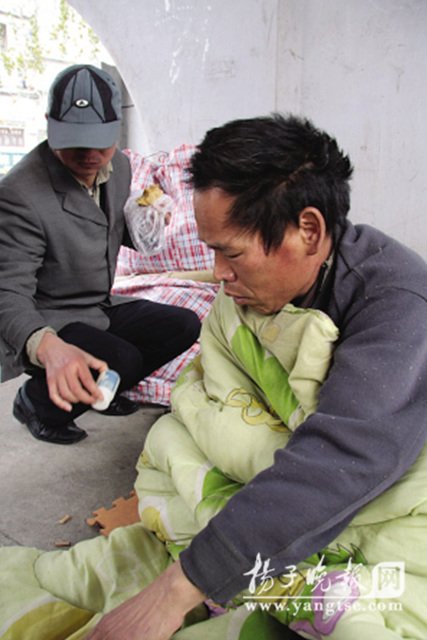 記者隨后來到“大傻”所睡的位置,發(fā)現(xiàn)這位綽號“大傻”的民工并沒有睡著,見到記者也是兩眼迷茫,后來他告訴記者,自己名叫王震學,今年46歲,安徽阜陽人,父母過世,只剩下自己孤身一人在外打工求生活,由于腿疼、肺部也有毛病,所以干不了重活,20天前得了重感冒,一直以來發(fā)燒不止,后來是一位在附近賣烤紅薯的老師傅給他買了一瓶安乃近。和王震學睡在一起的小湯說,王震學已經(jīng)20多天沒有起過床,這幾天也是基本吃不下飯,我真怕再不將他送進醫(yī)院,他也只有等死了。