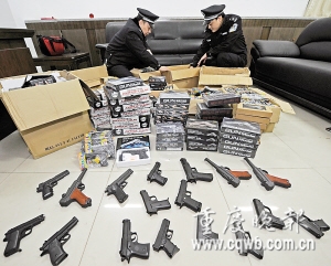 經(jīng)查,高個(gè)男子叫奉華(化名),今年32歲,在遂寧做玩具生意。前段時(shí)間聽朋友說,重慶某縣市場(chǎng)有仿真槍出售,仿真度高,價(jià)格便宜,他于是打算進(jìn)貨來遂寧賣。經(jīng)多方聯(lián)系,奉華與重慶商家接上了頭。1月19日15時(shí)許,他與舅子蔣某(矮個(gè)男子)開車從遂寧前往重慶某縣,以4420元購買了382支仿真手槍后,準(zhǔn)備運(yùn)回遂寧,不想剛走到潼南,就被警方擋獲。