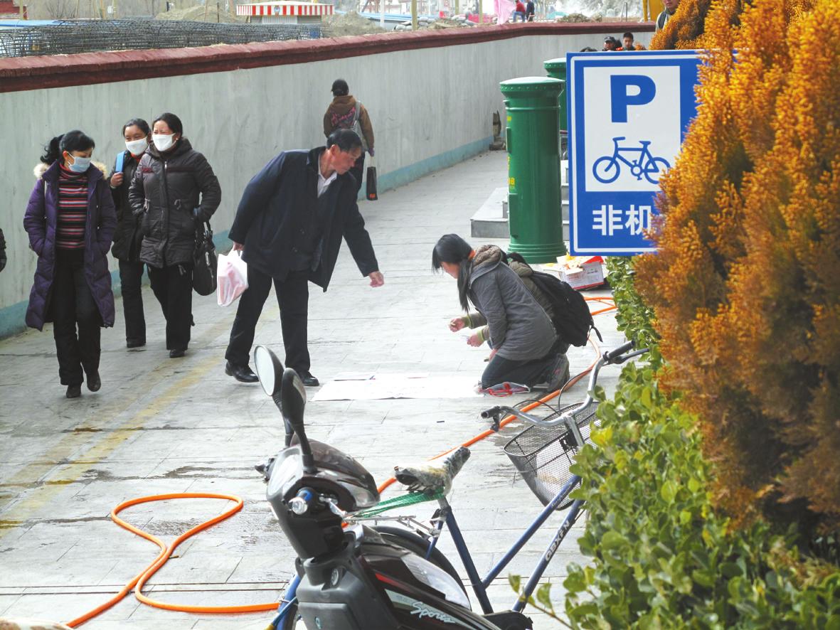 25日下午17時(shí)許,兩個(gè)15歲左右的女孩跪在北京中路郵電局前面的人行道上,以為母治病為名向來(lái)往路人乞討。附近一些商戶以及行人紛紛慷慨解囊,伸出援助之手。(王景蓮)