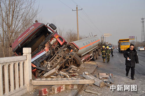 中新網(wǎng)洛陽1月27日電 (記者 李金輝 通訊員 王力)1月26日下午15時許,在洛陽市新安縣310國道磁澗鎮(zhèn)磁澗橋上,一輛滿載30噸氫氧化鈉的槽車不慎側(cè)翻,發(fā)生嚴重泄漏,周圍居民的生命安全受到極大威脅。