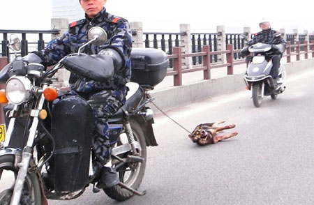 摩托車后系著一條鐵鏈,拖著一只血肉模糊的狗飛奔。昨天,一組被標著“慘無人道”標題的照片在福州各大論壇瘋傳,甚至被稱為福州版的虐狗門。拍下這些照片的網友表示,在春節(jié)期間看到如此一幕非常難受,而有網友認為這可能是有人在偷狗。