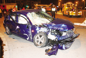 昨天(19日)下午5時(shí)15分許,(上海)浦東御橋路浦三路口處發(fā)生意外,一輛消防車與一小轎車在行駛中發(fā)生碰撞,消防車在沖倒路邊的欄桿和燈柱后側(cè)翻在地,小汽車則被反向甩出近20米遠(yuǎn),車內(nèi)一名新婚女子和一3月大的男嬰身受重傷,情勢(shì)危急,另有十余人輕傷。