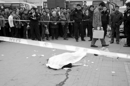 昨日11時40分許,鄭州市客運南站門前。一身穿黑色棉襖、灰色短褲的年輕女子,躺在地上,臉上、脖子處遍布血跡。一旁,救護人員正對其救治,近百名市民議論紛紛。