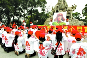 宣誓完畢,活動(dòng)進(jìn)入高潮,“老板們”后退一步,轉(zhuǎn)過(guò)身來(lái)面對(duì)著雷鋒畫(huà)像,齊齊雙膝跪地,以表示“對(duì)雷鋒精神的虔誠(chéng)和最高敬意”,然后起立對(duì)畫(huà)像三鞠躬。隨后,這些人又向路人散發(fā)活動(dòng)的紅色文化帽和文化衫,以號(hào)召更多人“向雷鋒同志學(xué)習(xí)”,把雷鋒精神轉(zhuǎn)化為自己的“心靈財(cái)富”。