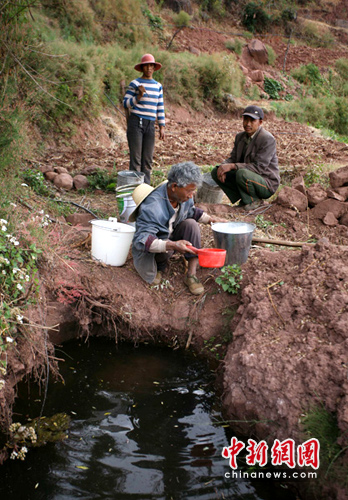 “1月18日,寨子里的井就徹底干了,200多人的飲用水告急。第二天,村民們在那塊低洼地挖了一個長1米左右,寬40公分的水洼,勉強能夠在那打水!逼饦s峰不停地給記者比劃當時的情況。之后,上灣村寨的村民就靠這一個小水洼暫時解決了生活用水。村民張春富說:“那點水根本不夠我們吃,每一家都是隔天挑水,而且還得分上午、下午輪著挑,那里還有水分來澆地的莊稼哦!