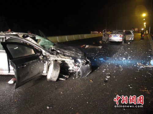據(jù)勘察現(xiàn)場的交警分析,當(dāng)時掛滬J86981號的福特轎車從鐵山港方向向市區(qū)行駛,當(dāng)行駛至二號橋附近時,沒有看到道路中間的隔離帶,一下沖上了隔離帶的緩坡。由于車速過快,轎車飛速砸向相向而來的一輛桂E36186的力帆轎車,造成車內(nèi)的乘員被拋出車外。完
