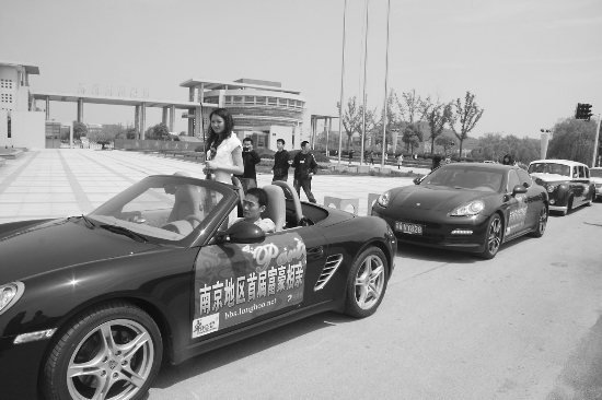 昨天上午9點多,3輛保時捷跑車依次駛至位于新模范馬路旁邊的南京郵電大學(xué)東門,每輛車的兩側(cè)車門均貼有大幅廣告,上面寫有“南京首屆富豪相親會”字樣。3輛名車停在路邊后,立即引來了無數(shù)路人圍觀,“平時在街頭偶而會看到一輛名車,3輛清一色的保時捷名車排在一起,真是少見!”市民程先生咂了咂嘴。