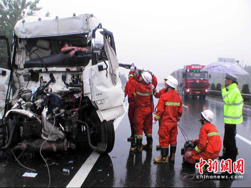 到達(dá)現(xiàn)場后,只見地上滿是兩車撞擊后散落的碎片,一輛車牌號為陜AA5477的貨車車尾已變形,車牌號為贛AA1398的追尾石油貨車車頭嚴(yán)重變形,車內(nèi)司機雙腿被方向盤卡住無法動彈,且受傷嚴(yán)重,生命垂危。另有一名婦女被困在后排座位,由于事發(fā)時婦女正平躺在后座睡覺,所以只被前排座位擠壓,尚有活動空間,并無危險。