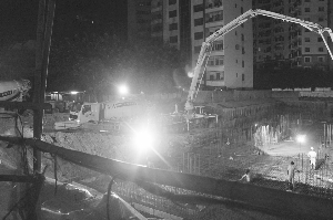 當(dāng)天凌晨1時許,記者來到該施工工地上,該工地開著明亮的燈光,挖出了三四米深的地基,一輛混凝土攪拌車發(fā)出“哐哐”的響聲,數(shù)十名工人正在地基上鏟水泥。凌晨1時20分許,市城管支隊特勤大隊的執(zhí)法人員趕赴現(xiàn)場,要求施工方立即停工!拔覀兒瓦@些混凝土公司預(yù)約好了,一停工會損失很多錢。”施工方一名負(fù)責(zé)人與執(zhí)法人員求情。執(zhí)法人員告知,目前屬于中考高考階段,決不允許建筑工地超時施工影響學(xué)生和周邊居民休息。執(zhí)法人員當(dāng)場責(zé)令正在趕工的混凝土攪拌車退出施工地點(diǎn)。