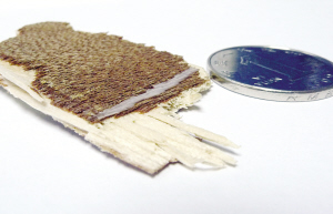 記者看到304室北面小屋的門,有一部分用牛皮紙貼上,輕輕撕開紙,赫然出現(xiàn)一個大洞。她說這是有天早晨喊女兒起床時敲通的。一個年過半百的女子,竟然敲門時就輕易地把門敲通,可見這門板的質(zhì)量。果然,記者很輕易就掰下一塊面板,這種復(fù)合木板的厚度不到3毫米,難怪經(jīng)不起“敲”。