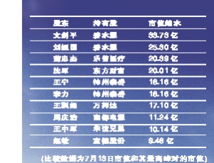 作為今年上半年身家縮水最多的創(chuàng)業(yè)板富豪,碧水源的文劍平與劉振國,其市值相比最高峰時分別縮水了33.73億和25.30億,其縮水比例高達51.35%。而同樣在創(chuàng)業(yè)板富豪身家縮水排行榜中名列前十的趙敏,按寶德股份7月13日收盤價16.67元來算,現(xiàn)持有4590萬股市值為7.65億,相比其最高市值時的17.14億,財富縮水了9.48億,其縮水比更是高達55.35%,成為今年上半年縮水比例最高的創(chuàng)業(yè)板富豪。而寶德股份、碧水源、金亞科技及東方財富則成為今年上半年創(chuàng)業(yè)板縮水最大的個股,股價分別縮水55.35%、51.35%、50.00%和49.99%。