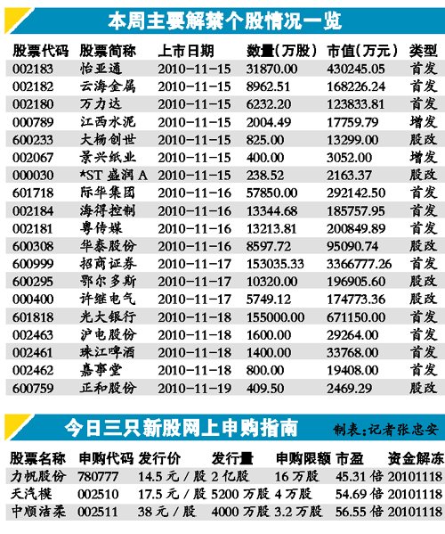 本周解禁時間主要集中在15日,合計解禁市值接近70億元,解禁壓力十分集中。此外,周內存在“小非”持股解禁的萬力達、云海金屬、怡亞通、遼寧成大、海得控制、招商證券、正和股份,投資者需謹慎對待。 (文/表 記者張忠安)