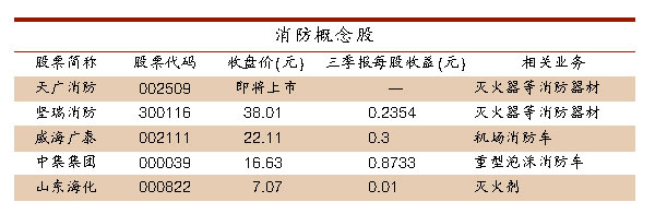 某不愿具名的私募人士向 《每日經(jīng)濟(jì)新聞》記者介紹,目前A股市場(chǎng)包括即將上市的天廣消防(002509)在內(nèi),涉及到消防器材及其相關(guān)領(lǐng)域的上市公司共有5家。其中,9月份剛登陸創(chuàng)業(yè)板的堅(jiān)瑞消防(300116,收盤價(jià)38.01元)和即將登陸深圳中小板的天廣消防均為一線消防設(shè)備生產(chǎn)制造商;威海廣泰(002111,收盤價(jià)22.11元)等公司為輔助設(shè)備生產(chǎn)制造商。