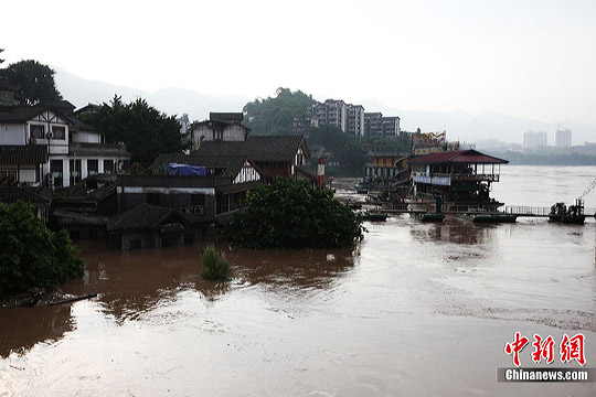 7月19日,今年入汛以來最大洪峰經(jīng)過重慶主城,長江、嘉陵江水位上漲。記者在重慶古鎮(zhèn)磁器口看到,從磁器口江邊至磁器口街道的梯坎已“隱”于水面下,標志性牌匾龍隱門沒至“腰部”,靠近江邊的商鋪及民居被淹。目前,大部分商家、市民接預(yù)警已提前撤場歇業(yè)或撤離至安全地帶。截至記者趕赴磁器口途中,部分必經(jīng)路段已實施交通管制,磁器口正街漲水期間亦采取禁行措施。據(jù)長江水利委員會水文局監(jiān)測數(shù)據(jù),19日20時長江重慶寸灘站水位超過185米,這是重慶遭遇的長江今年以來最大洪峰。截至20日0時,長江重慶水位仍在185.06米的峰值上流動,洪峰仍在過境重慶。 劉函冉 攝