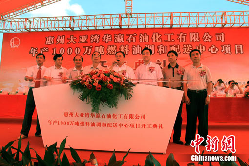 總投資53.9億元人民幣,設(shè)計(jì)年生產(chǎn)能力達(dá)1000萬噸的廣東惠州大亞灣華瀛石油化工有限公司燃料油調(diào)和配送中心項(xiàng)目9日正式動(dòng)工建設(shè)。該項(xiàng)目是廣東省重點(diǎn)項(xiàng)目,建成投產(chǎn)后或?qū)⒊蔀橹袊?guó)最大燃料油調(diào)和配送中心。 圖為惠州市委書記黃業(yè)斌宣布惠州大亞灣華瀛石油化工有限公司燃料油調(diào)和配送中心項(xiàng)目開工?敌⒕ 攝