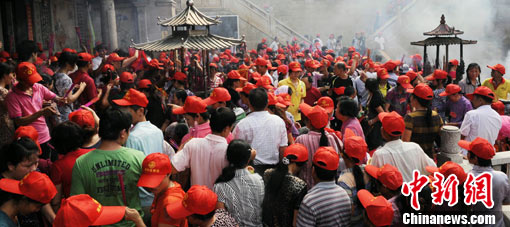 隨著媽祖羽化升天紀(jì)念日臨近,前往福建莆田湄洲媽祖祖廟謁祖進(jìn)香的海內(nèi)外媽祖信眾絡(luò)繹不絕。圖為廣東中山市瞻部洲勝母宮600多位媽祖信眾組成謁祖進(jìn)香團(tuán),恭請(qǐng)100多尊神像到湄洲媽祖祖廟謁祖進(jìn)香,該進(jìn)香隊(duì)伍人員都是在廣東辦廠(chǎng)經(jīng)商的臺(tái)胞。高亞成 攝