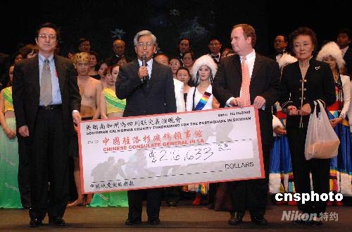 當?shù)貢r間五月十五日晚,南加州華僑華人在洛杉磯縣圣蓋博市舉行為四川地震災區(qū)賑災義演晚會,當?shù)厝A僑華人、社團、企業(yè)和留學生等當場為災區(qū)捐款二十一萬多美元。圖為中國駐洛杉磯總領事張云(前左二)表示,總領館將盡快把善款轉交給地震災區(qū)。中新社發(fā) 張煒 攝