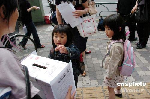 5月18日,一位日本小朋友為四川大地震災區(qū)捐款。當日,日本僑報社創(chuàng)辦的星期日漢語角舉行第40次交流會,主題為“向四川震區(qū)人民獻愛心”募捐和義賣活動。漢語角參加者來到繁華的池袋車站進行街頭募捐,全力支援中國抗震救災。中新社發(fā) 段躍中 攝
