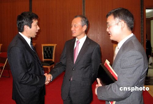 近日,中國(guó)駐日本大使崔天凱在東京舉辦2009旅日華僑華人新春招待會(huì)。會(huì)上,崔大使親切會(huì)見了日本人漢語(yǔ)征文大賽主辦者和贊助單位負(fù)責(zé)人,聽取他們的匯報(bào)。圖為崔大使會(huì)見大賽贊助單位社長(zhǎng)。中新社發(fā) 段躍中 攝