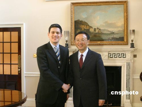 當(dāng)?shù)貢r間二月一日下午,陪同溫家寶總理訪英的中國外長楊潔篪在倫敦會晤英國外交大臣米利班德。中新社發(fā) 張朔 攝