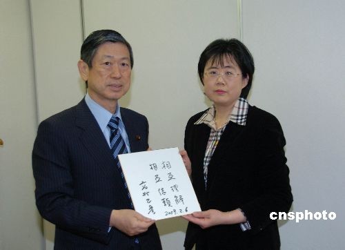 2月6日上午,日本前外相、日中友好議員聯(lián)盟會長、眾議院議員高村正彥,在東京接見了第四屆中國人日語征文大賽主辦單位日本僑報社代表和兩名最優(yōu)秀獎(日本大使獎)獲獎?wù)摺本┐髮W(xué)研究生徐蓓和湘潭大學(xué)青年教師張桐赫。高村正彥聽取了日本僑報社關(guān)于日中作文大賽的匯報,高度評價大賽為促進日中兩國人民的相互理解起了積極的作用。高村勉勵獲獎?wù)吆退袇①愓呃^續(xù)努力,為日中交流作出更大貢獻。高村正彥當(dāng)場揮毫,題寫了“相互理解 相互信賴”,表達對日中兩國青少年的期待。中新社發(fā) 段躍中 攝