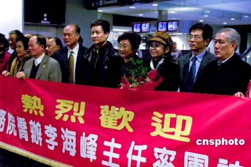 當(dāng)?shù)貢r(shí)間二月十日,中國(guó)國(guó)務(wù)院僑辦主任李海峰率領(lǐng)“文化中國(guó)·四海同春”藝術(shù)團(tuán)一行抵達(dá)舊金山,開始為期四天的藝術(shù)之旅,與當(dāng)?shù)厝A人華僑共慶新春。中國(guó)駐舊金山總領(lǐng)事高占生、華商總會(huì)會(huì)長(zhǎng)黃錫海及顧問(wèn)池洪湖、魏需遜等僑界代表到機(jī)場(chǎng)迎接。 中新社發(fā) 陳鋼 攝