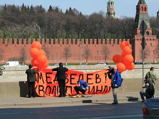 據(jù)俄羅斯新聞網(wǎng)報(bào)道,俄羅斯反對(duì)黨“團(tuán)結(jié)運(yùn)動(dòng)”組織成員4月28日在克里姆林宮前舉行了聲勢(shì)浩大的反政府游行活動(dòng)。期間,3名“團(tuán)結(jié)運(yùn)動(dòng)”的積極分子在克里姆林宮附近的河岸邊懸掛紅色的巨型橫幅,上面印有:“梅德維杰夫,辭去普京總理職務(wù)!弊謽,橫幅兩邊系有紅色的氣球,橫幅下部印有“團(tuán)結(jié)運(yùn)動(dòng)”組織的徽標(biāo)。