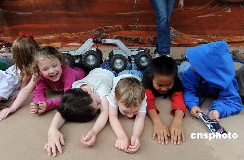 美國(guó)國(guó)家航空航天局(NASA)下屬的噴氣推進(jìn)實(shí)驗(yàn)室(JPL)當(dāng)?shù)貢r(shí)間五月二日對(duì)公眾開(kāi)放,當(dāng)?shù)財(cái)?shù)千民眾不懼潛在的“豬流感”威脅,參觀這座代表美國(guó)尖端航天科技的科研基地。圖為兒童體驗(yàn)月球車模型的爬坡技能。噴氣推進(jìn)實(shí)驗(yàn)室位于洛杉磯附近的帕薩迪納市,目前主要從事太陽(yáng)系行星探測(cè)任務(wù)等。中新社發(fā) 張煒 攝