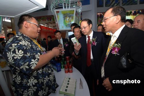 十一月十八日,臺灣商人陳志惟(左一)在閩臺農(nóng)業(yè)合作成果館里向國務(wù)院臺辦副主任鄭立中(右二)介紹自己的產(chǎn)品。當日,第九屆海峽兩岸(福建漳州)花卉博覽會暨農(nóng)業(yè)合作洽談會在福建漳州花博園開幕。中新社發(fā) 王東明 攝