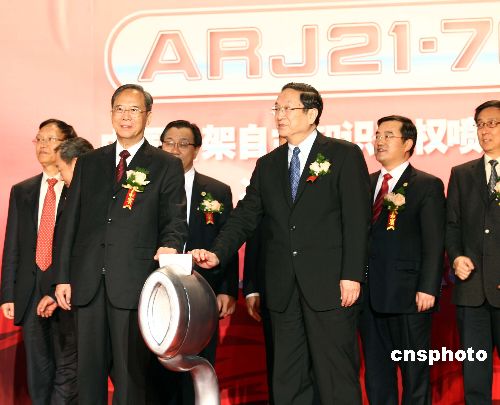 十二月二十一日,由中國(guó)航空工業(yè)第一集團(tuán)公司(中國(guó)一航)自行研制生產(chǎn)的中國(guó)首架自主知識(shí)產(chǎn)權(quán)噴氣支線客機(jī)ARJ21-700飛機(jī),在上海飛機(jī)制造廠順利實(shí)現(xiàn)總裝下線。中國(guó)國(guó)務(wù)院副總理曾培炎(前排左)和中共中央政治局委員、上海市市委書記俞正聲(前排右)出席隆重的總裝下線儀式。中新社發(fā) 文音 攝