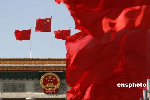 圖:北京天安門廣場(chǎng)紅旗飄飄迎“兩會(huì)”