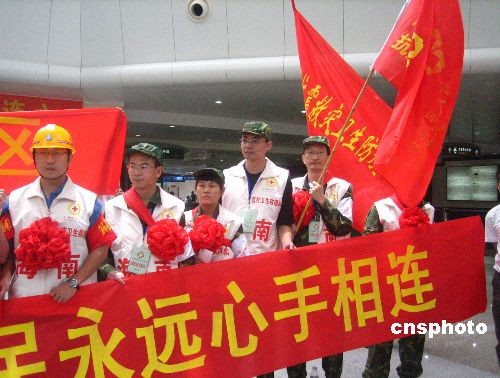 五月二十日,首批海南青年醫(yī)療衛(wèi)生抗震救災(zāi)志愿者服務(wù)隊(duì)共二十五人,從?诿捞m機(jī)場(chǎng)出發(fā),前往四川綿陽(yáng)平武縣抗震救災(zāi)。該批具有專業(yè)醫(yī)療技能及抗震經(jīng)驗(yàn)的志愿者,來(lái)自海南省人民醫(yī)院、海南省及各市縣疾控中心,由海南省衛(wèi)生廳及共青團(tuán)海南省委共同招募。