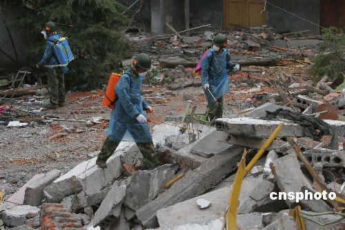 圖:防疫隊(duì)對地震的重災(zāi)區(qū)紅白鎮(zhèn)進(jìn)行防疫工作