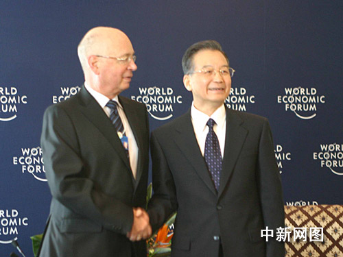 當(dāng)?shù)貢r(shí)間一月二十八日中午,中國總理溫家寶在瑞士達(dá)沃斯會見世界經(jīng)濟(jì)論壇主席施瓦布(左)。施瓦布對溫家寶出席本次論壇年會表示熱烈歡迎。張朔 攝