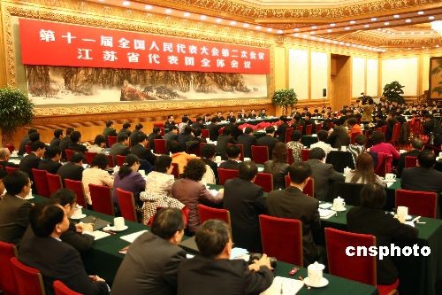 3月7日,全國(guó)人大江蘇代表團(tuán)在人民大會(huì)堂舉行全體會(huì)議。中新社發(fā) 杜洋 攝