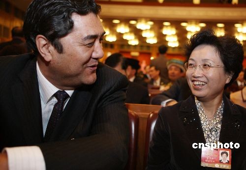 3月9日,十一屆全國人大二次會(huì)議第二次全體會(huì)議在北京人民大會(huì)堂舉行,剛剛利用大會(huì)休息日到天津考察鐵路建設(shè)的青海省女省長宋秀巖,向鄰坐的新疆維吾爾自治區(qū)政府主席努爾·白克力請(qǐng)教鐵路建設(shè)的經(jīng)驗(yàn)。中新社發(fā) 任晨鳴 攝