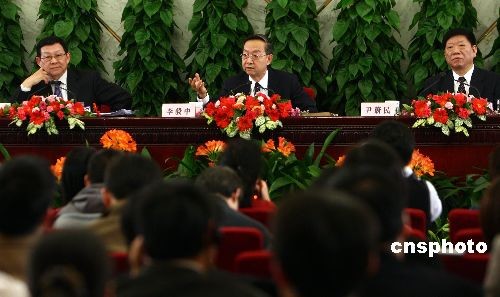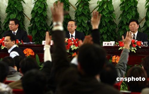 3月10日,十一屆全國人大二次會議在人民大會堂舉行記者會,工業(yè)和信息化部部長李毅中(中)、人力資源和社會保障部部長尹蔚民(右)、商務部部長陳德銘(左)就“擴內(nèi)需、促就業(yè)、保增長”答記者問。中新社發(fā) 杜洋 攝