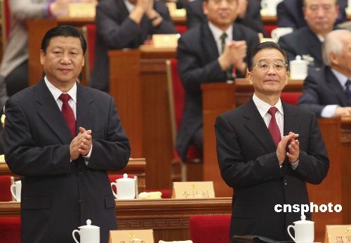 3月12日,全國(guó)政協(xié)十一屆二次會(huì)議舉行閉幕大會(huì)。國(guó)務(wù)院總理溫家寶與國(guó)家副主席習(xí)近平出席閉幕大會(huì)。中新社發(fā) 盛佳鵬 攝