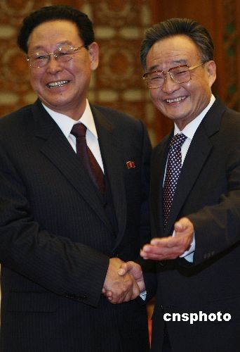 3月19日下午,中國(guó)全國(guó)人大常委會(huì)委員長(zhǎng)吳邦國(guó)在北京人民大會(huì)堂會(huì)見(jiàn)朝鮮民主主義人民共和國(guó)內(nèi)閣總理金英日。中新社發(fā) 任晨鳴 攝
