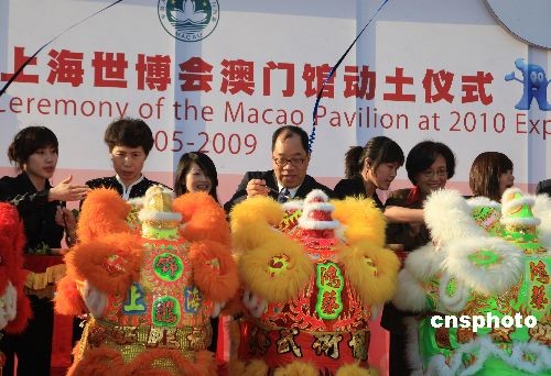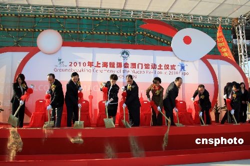 5月8日,2010年上海世博會(huì)澳門(mén)館舉行動(dòng)土儀式。澳門(mén)特別行政區(qū)經(jīng)濟(jì)財(cái)政司司長(zhǎng)譚伯源、中央人民政府駐澳門(mén)特別行政區(qū)聯(lián)絡(luò)辦公室副主任高燕、上海世博會(huì)執(zhí)行委員會(huì)專職副主任鐘燕群等為儀式主禮,來(lái)自澳門(mén)的立法議員、人大代表、工商界以及國(guó)際商會(huì)代表等超過(guò)150人出席儀式。澳門(mén)館─“玉兔宮燈”位于中國(guó)館區(qū),主體建筑高19.99米,寓意澳門(mén)回歸的年份1999,別具意義。中新社發(fā) 潘索菲 攝