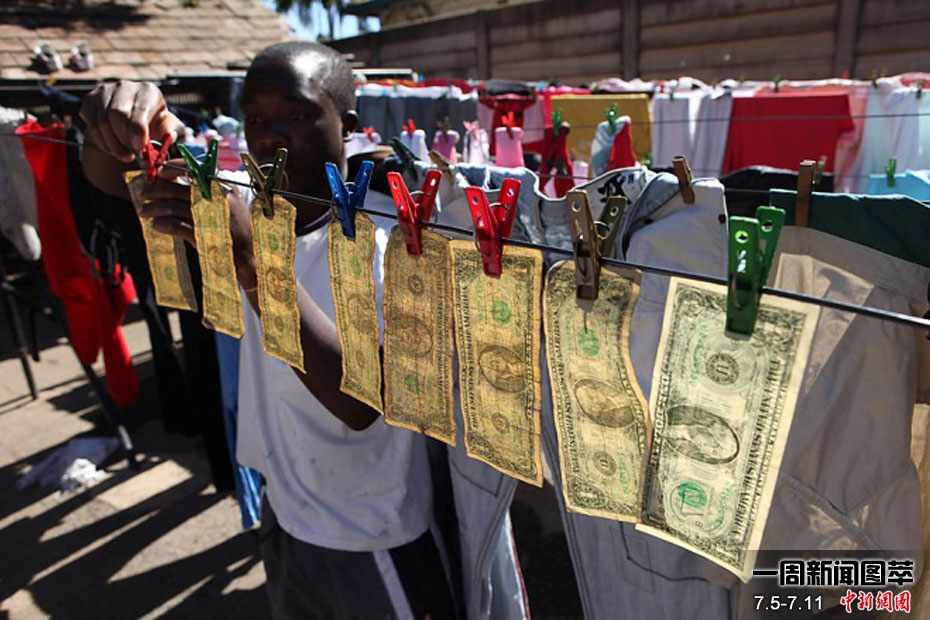 7月6日周二,津巴布韋哈拉雷,阿萊克斯•姆龐迪晾曬清洗過的美鈔。據(jù)當(dāng)?shù)厝苏f,這些美鈔流通到本國(guó)時(shí)因異味太濃無法使用。去年津巴布韋政府宣布美元為法定貨幣。