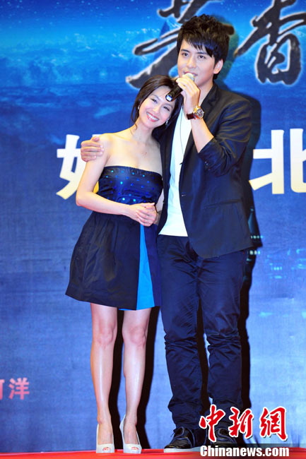 8月25日,電影《芳香之城傳奇》在北京舉行記者會(huì)。不老的“紫霞仙子”朱茵攜主演扎西頓珠、張達(dá)明、李子雄、張璇、董立范等亮相。朱茵以一襲抹胸短裙亮相,自曝在新片中大轉(zhuǎn)型,飾演一個(gè)有天然體香的神秘啞女,男主角扎西頓珠飾演的“富二代”被其吸引后,上演了一段純美姐弟戀。朱茵在接受采訪時(shí)坦言自己并不拒絕姐弟戀。圖為朱茵、扎西頓珠現(xiàn)場秀親昵。中新社記者 李學(xué)仕 攝
