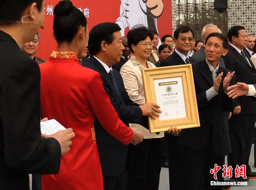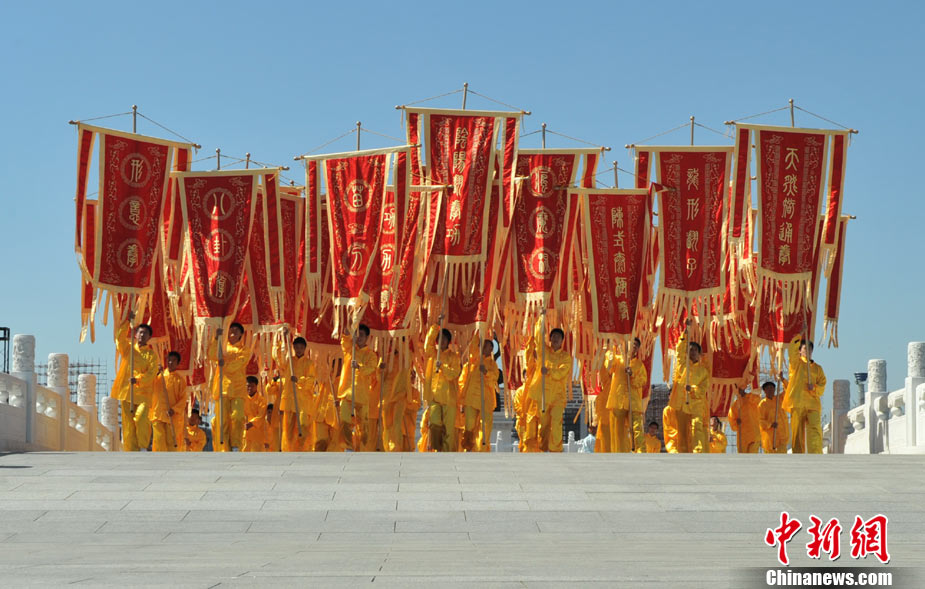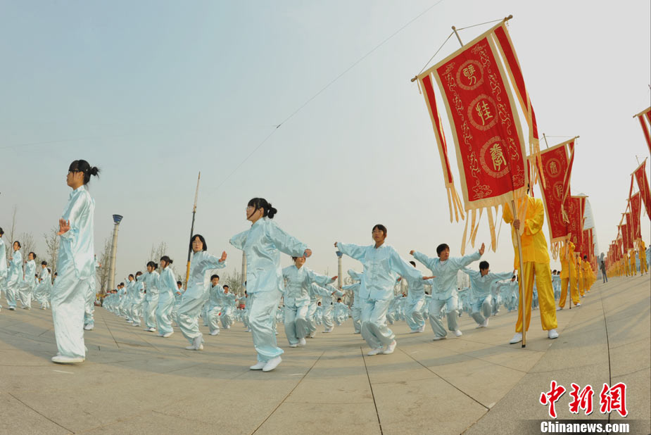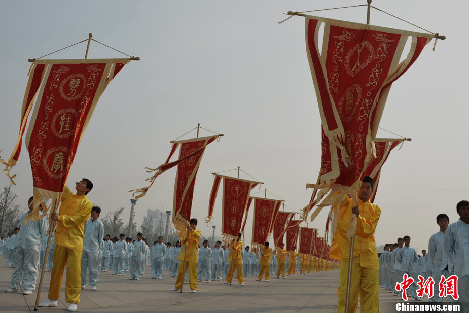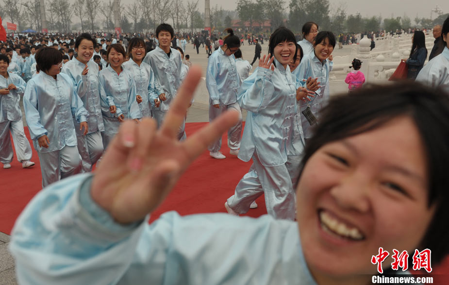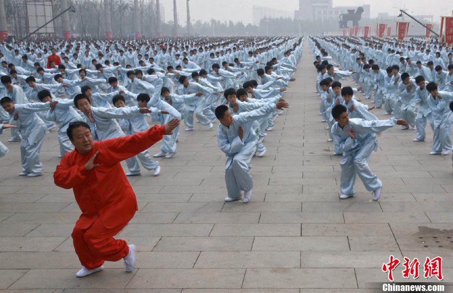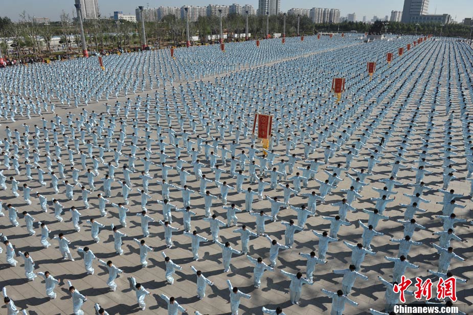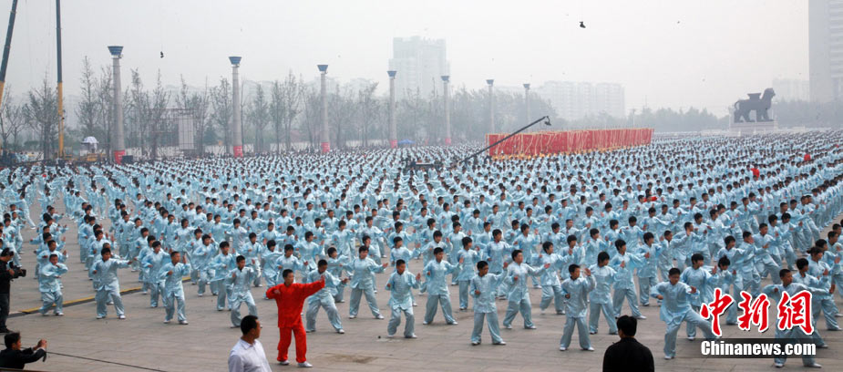 10月10日,中國“武術(shù)之鄉(xiāng)”滄州獅城公園廣場“拳濤”滾滾、武健泱泱,1.5萬人同習(xí)53個拳種,創(chuàng)造了《中國武術(shù)拳種同時展演數(shù)量之最》吉尼斯紀(jì)錄,上海大世界吉尼斯總部現(xiàn)場認(rèn)證。圖為萬人習(xí)武現(xiàn)場。王少華 張書儉 攝